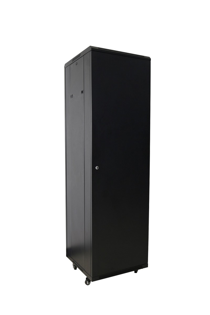 42U free-standing rack cabinet with 80 cm depth; glass front door, steel rear door, lockable front and rear doors, removable side panels, 4 fans included, not assembled.