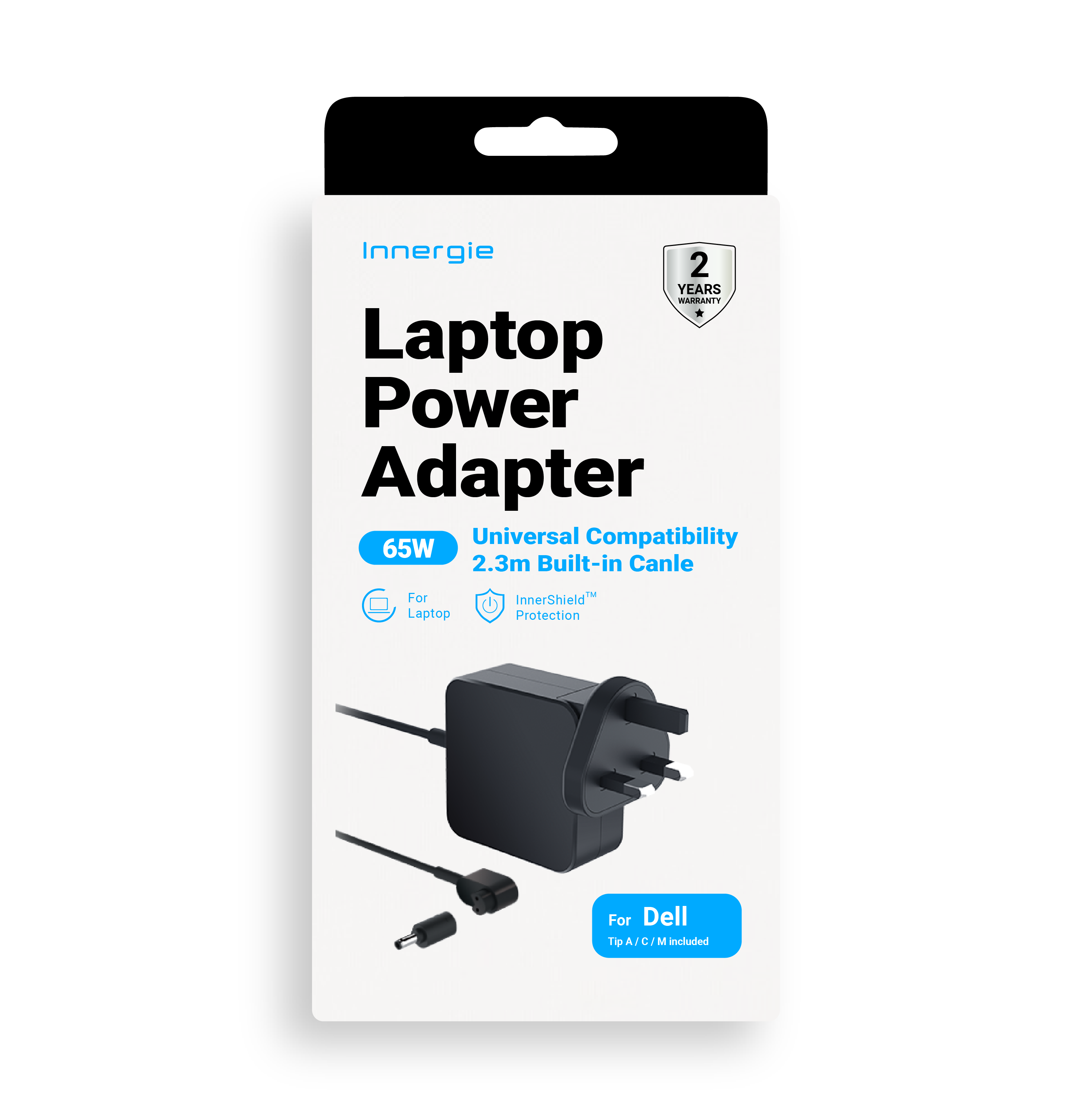 65W laptop power adapter with 3 tips for most brands and a 2.3m built-in cable for easy charging.