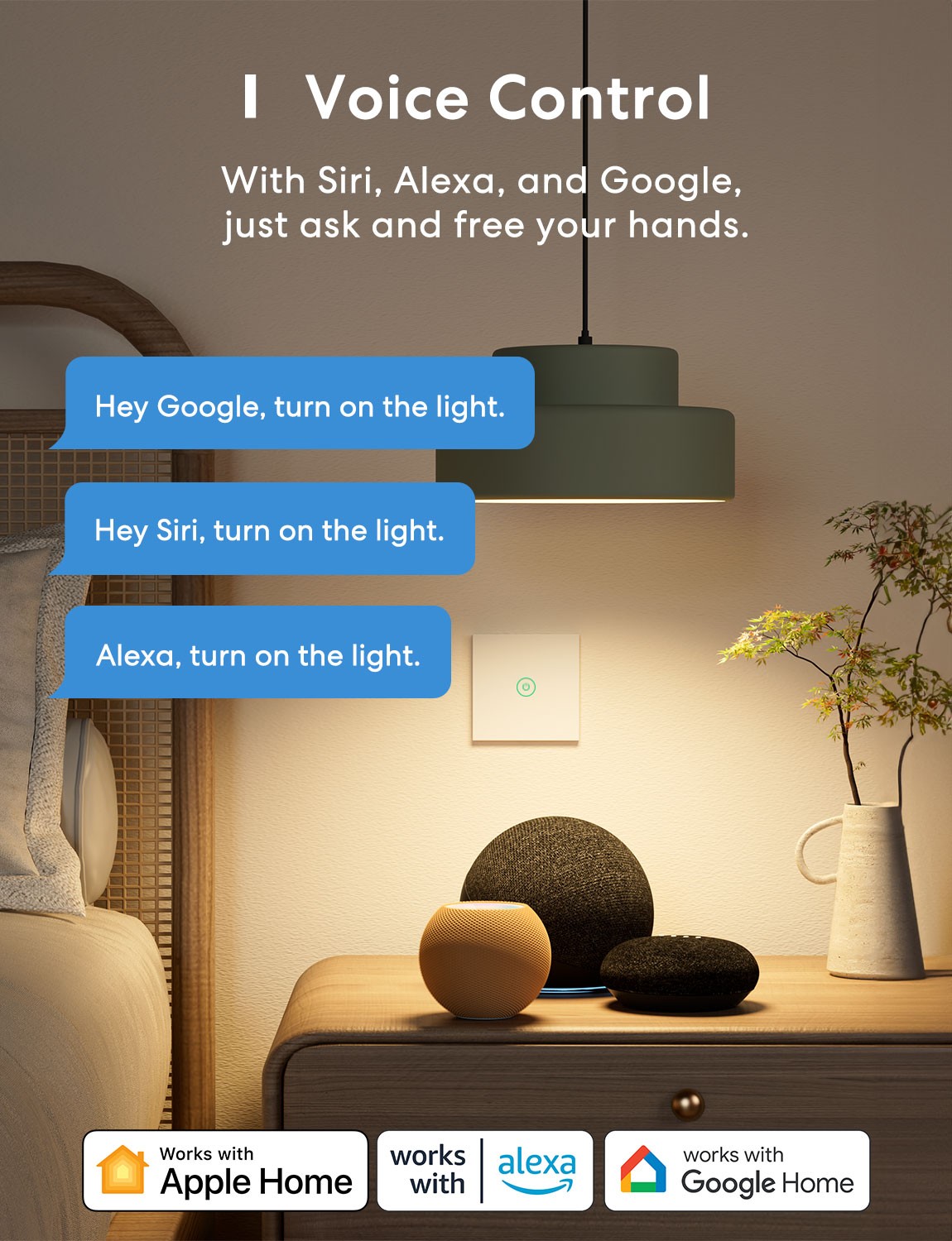- Works with Apple HomeKit, Amazon Alexa, and Google Assistant.