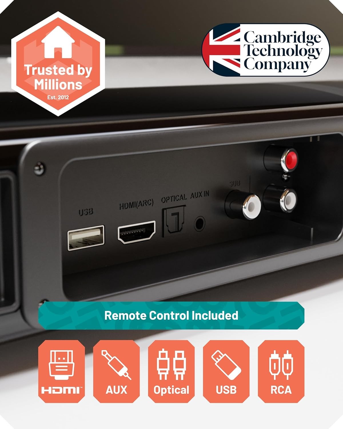 Powerful 200W 2.1-channel soundbar with wireless subwoofer, Bluetooth, HDMI, and USB by Oakcastle.