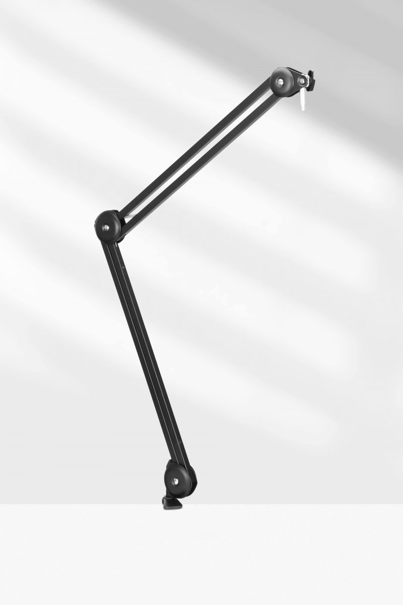 Spring-loaded adjustable microphone arm for streaming and podcasting.