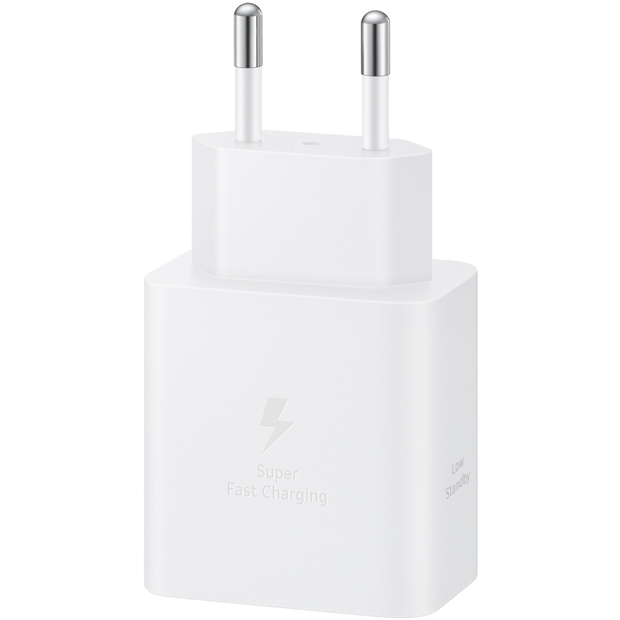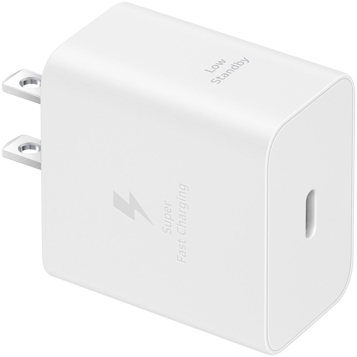 Samsung 45W fast charger with 5A USB-C cable, 100-240V AC input, 1.8 m cable, White.