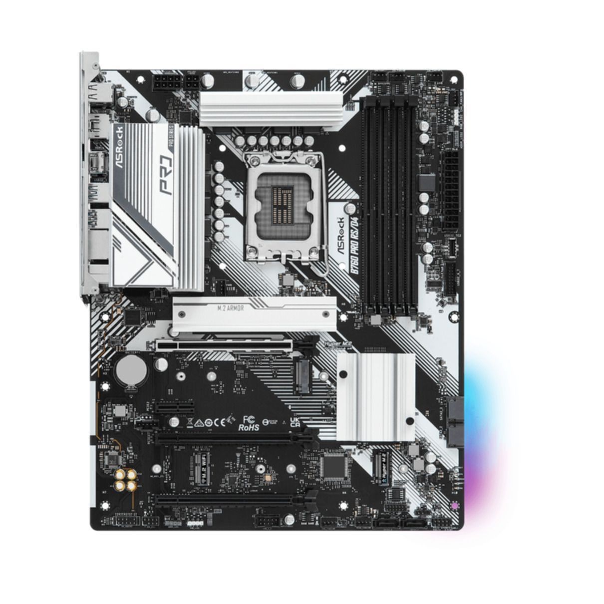 Asrock B760 Pro RS/D4. Processor manufacturer: Intel. Processor socket: LGA 1700. Compatible processor series: Intel® Core™ i3. Intel® Core™ i5. Intel® Core™ i7. Intel® Core™ i9. Supported memory types: DDR4-SDRAM. Maximum internal memory: 128 GB. Memory slots type: DIMM. Supported storage drive interfaces: M.2. SATA III. Supported storage drive types: HDD & SSD. RAID levels: 0. 1. 5. 10. Ethernet interface type: 2.5 Gigabit Ethernet. LAN controller: Realtek RTL8125-BG. Component for: PC. Motherboard form factor: ATX. Motherboard chipset family: Intel