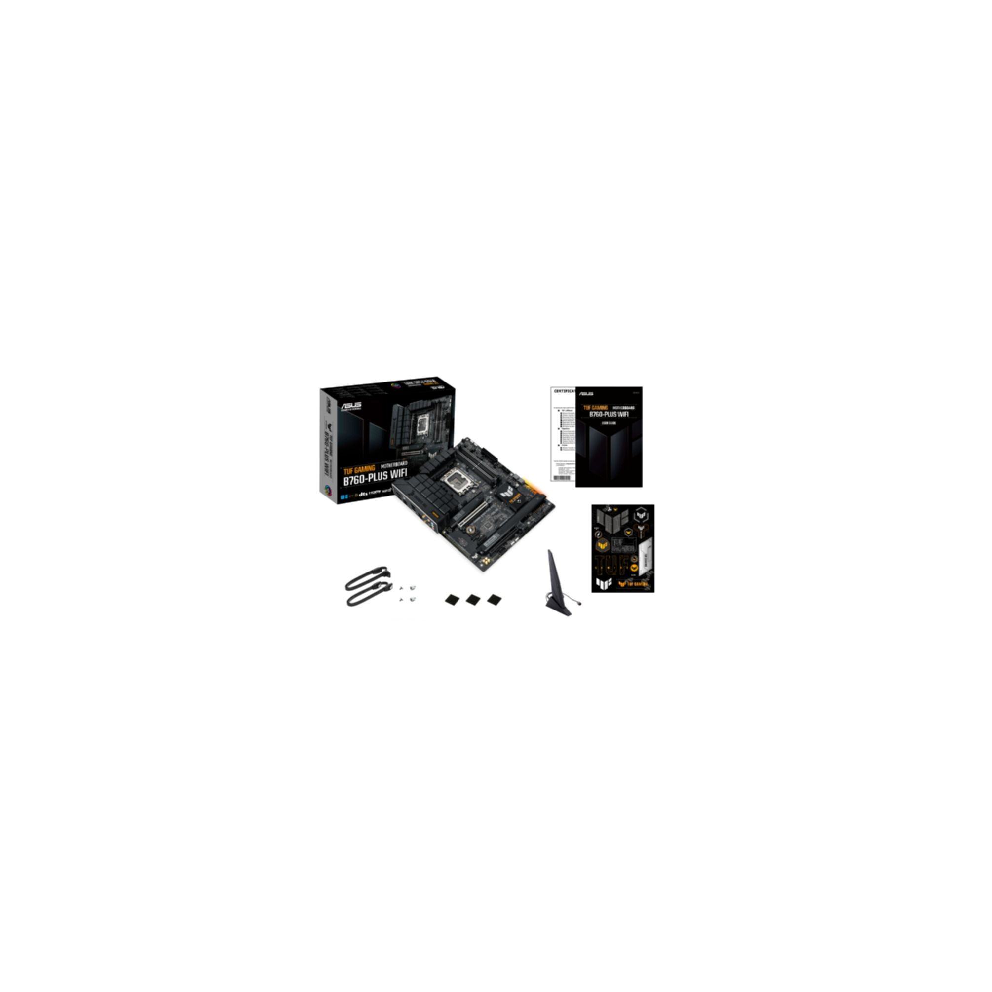 ASUS TUF Gaming B760-Plus WIFI. Processor manufacturer: Intel. Processor socket: LGA 1700. Compatible processor series: Intel® Celeron®. Intel® Core™ i3. Intel® Core™ i5. Intel® Core™ i7. Supported memory types: DDR5-SDRAM. Maximum internal memory: 128 GB. Memory slots type: DIMM. Supported storage drive interfaces: M.2. PCI Express 3.0. PCI Express 5.0. SATA III. Supported storage drive types: HDD & SSD. RAID levels: 0. 1. 5. 10. Ethernet interface type: 2.5 Gigabit Ethernet. Top Wi-Fi standard: Wi-Fi 6E (802.11ax). Wi-Fi standards: 802.11a. 802.11g. Wi-Fi 4 (802.11n). Wi-Fi 5 (802.11ac). Wi-Fi 6 (802.11ax). Component for: PC. Motherboard form factor: ATX. Motherboard chipset family: Intel