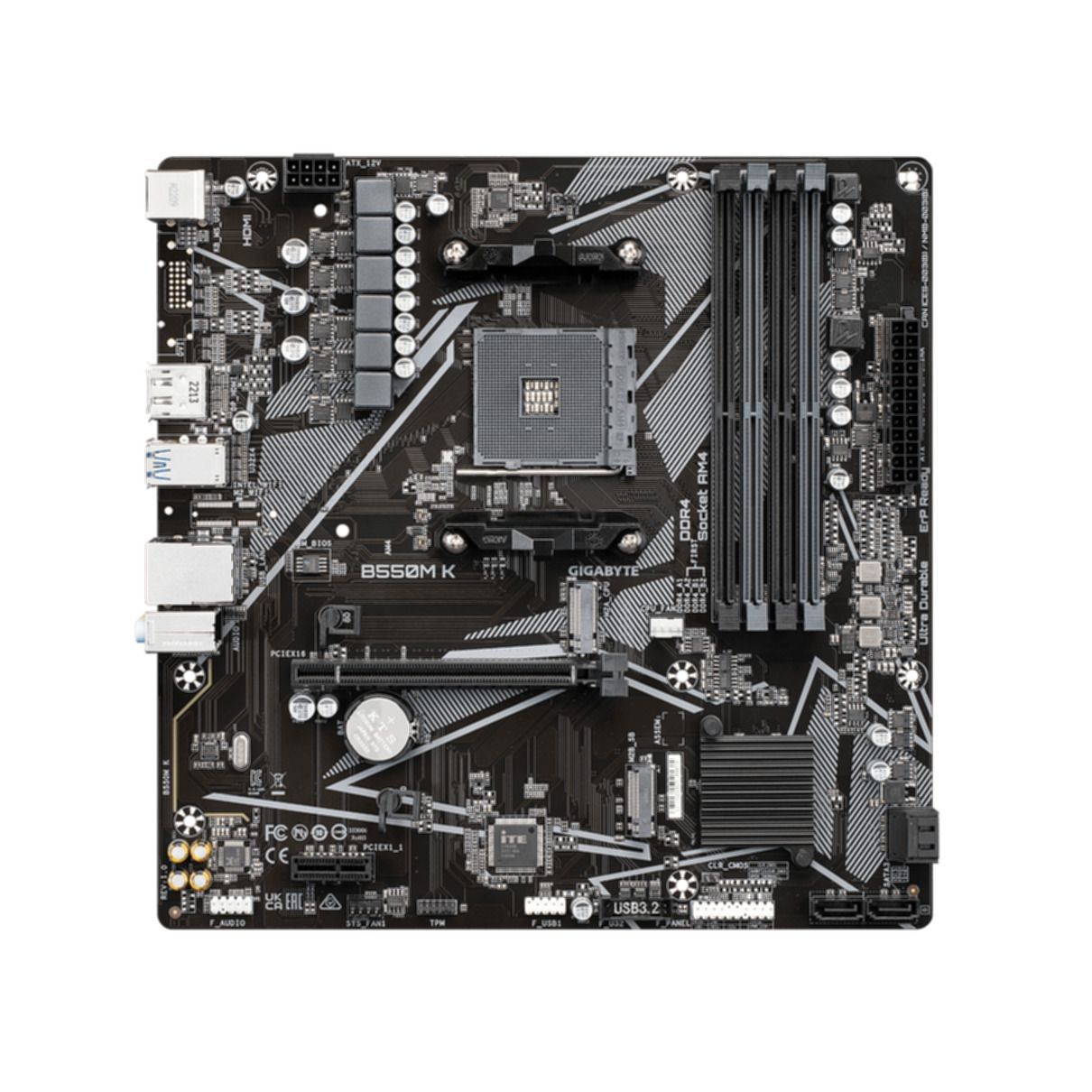 GIGABYTE B550M K Motherboard - AMD Ryzen 5000 CPUs. up to 4733MHz DDR4. 1xPCIe 4.0 + 1xPCIe 3.0 M.2. 1GbE LAN. USB 3.2 Gen 1. Processor manufacturer: AMD. Processor socket: Socket AM4. Compatible processor series: AMD Ryzen 3000 Series. AMD Ryzen 4000 Series. AMD Ryzen 5000 Series. Supported memory types: DDR4-SDRAM. Maximum internal memory: 128 GB. Memory slots type: DIMM. Supported storage drive interfaces: M.2. SATA. Supported storage drive types: HDD & SSD. RAID levels: 0. 1. 10. Maximum resolution: 5120 x 2880 pixels. Ethernet interface type: Gigabit Ethernet. LAN controller: Realtek RTL8111H