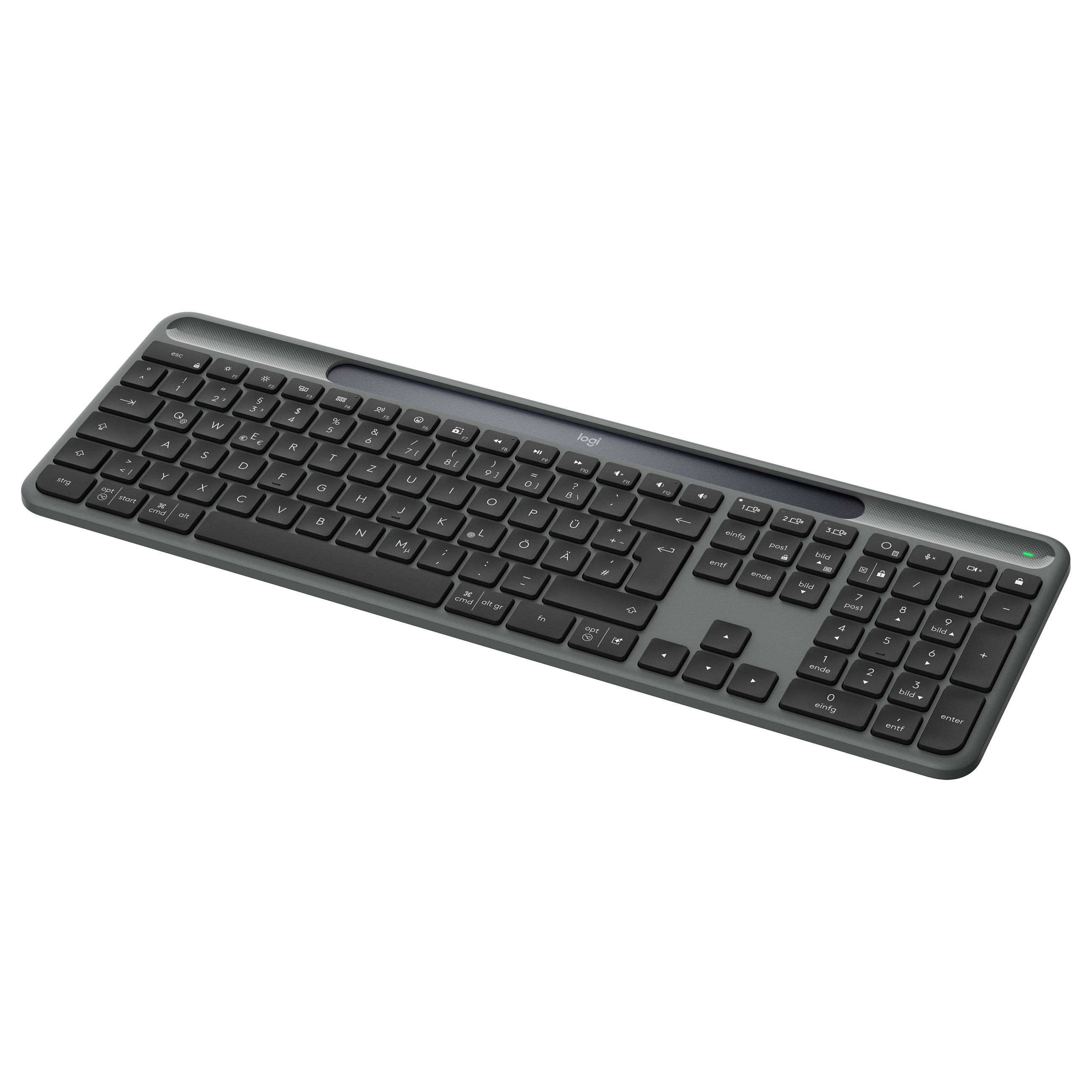 Logitech Signature Slim Solar+ K980: Ultra-slim wireless QWERTZ keyboard with solar power. RF + Bluetooth multi-device. No charging needed with ambient light. German layout, graphite. Full-size, quiet keys for office.