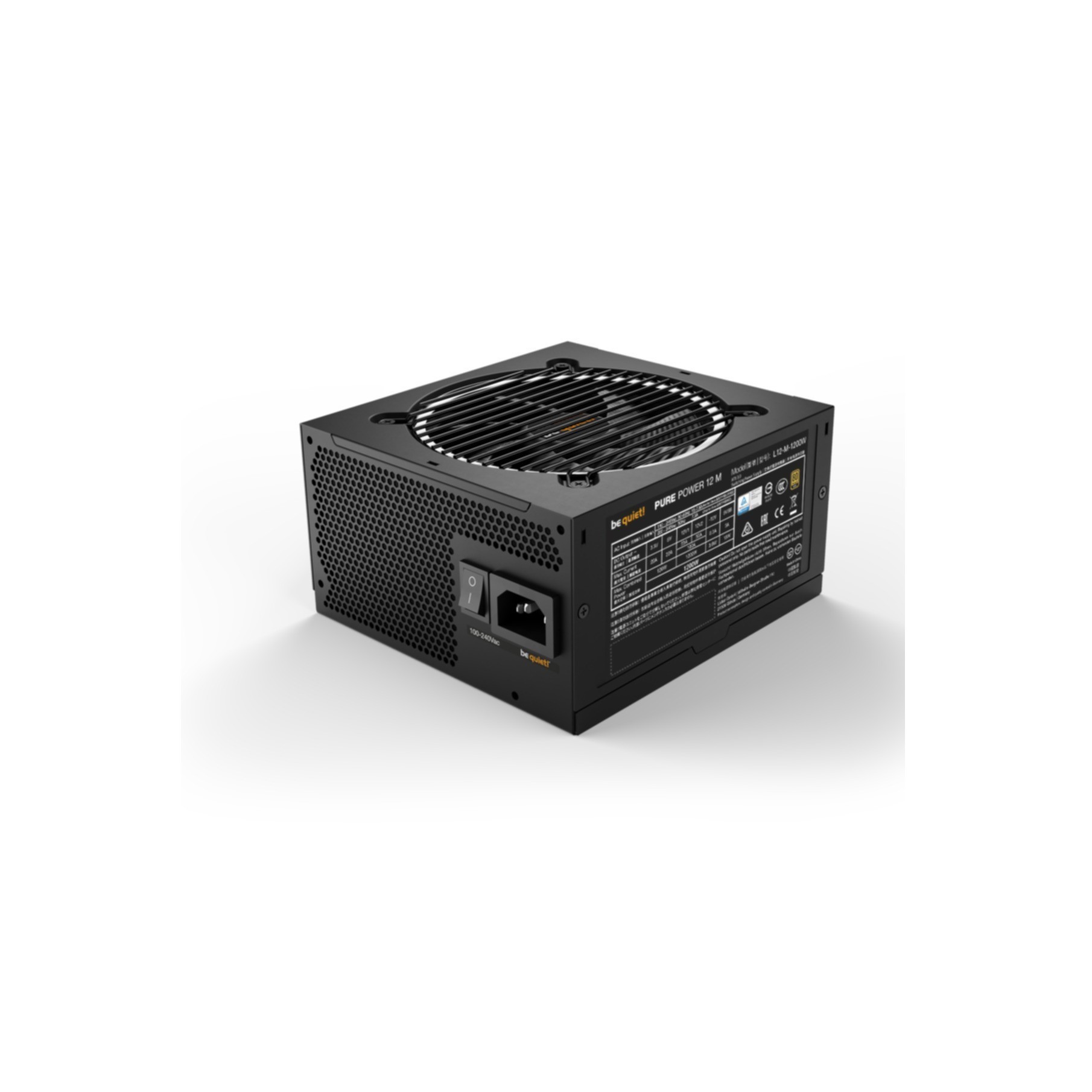 be quiet! PURE POWER 12 M | 1200W. Total power: 1200 W. AC input voltage: 100 - 240 V. Peak power: 1250 W. Motherboard power connector: 20+4 pin ATX. Motherboard power cable length: 55 cm. SATA power cable length: 500.650.800.950 mm. Purpose: PC. Power supply unit (PSU) form factor: ATX. 80 PLUS certification: 80 PLUS Gold. Product colour: Black. Cooling type: Active. Fan diameter: 12 cm. Cables included: AC. CPU. PATA. PCIe. SATA