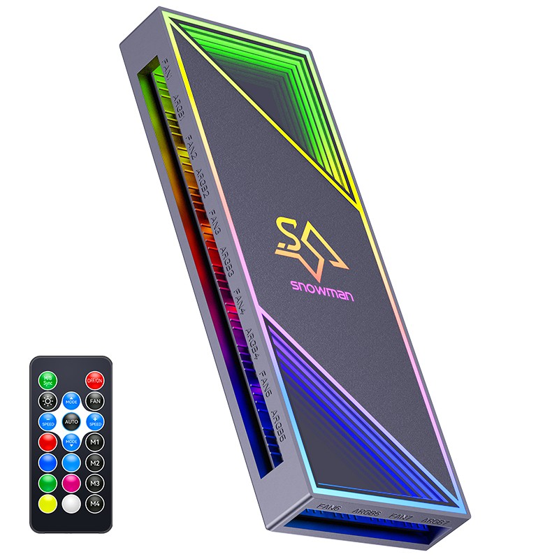 Snowman H12 ARGB Fan Controller Hub supports up to 12 PWM fans and ARGB strips via 4-pin PWM and 5V 3-pin ARGB. Includes remote control for speed and RGB lighting sync. Black design with SATA power. Ideal for PC case cooling.