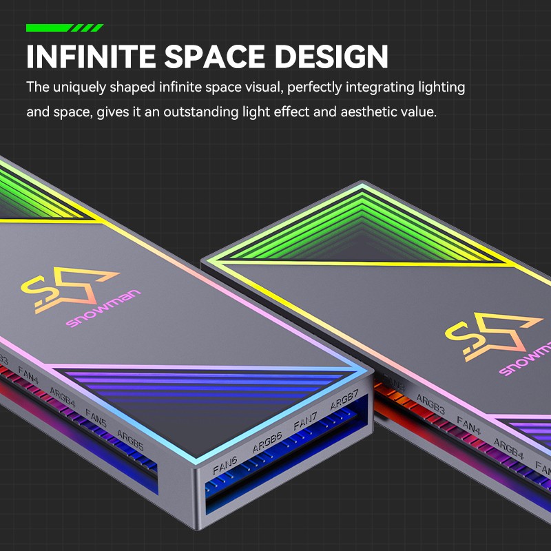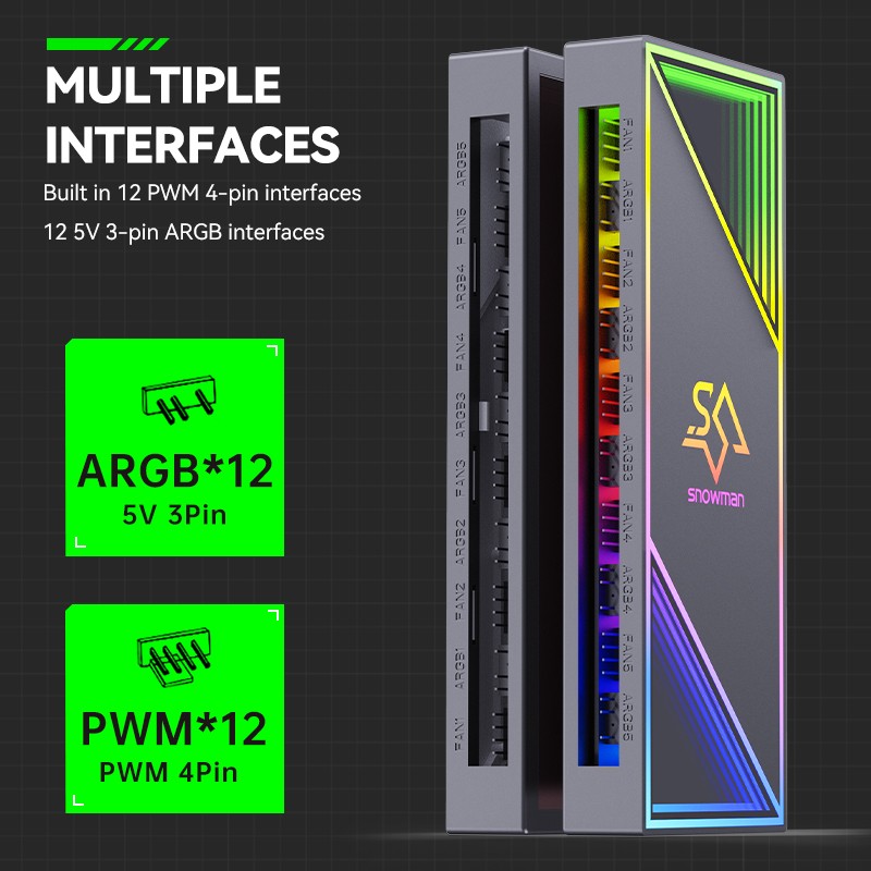 The Snowman H12 is a versatile ARGB fan controller hub designed for PC enthusiasts seeking advanced cooling management. It connects up to 12 fans through PWM 4-pin connectors for precise speed control and supports 5V 3-pin ARGB devices for synchronized lighting effects. A included remote control allows easy adjustment of fan speeds and RGB modes without software.