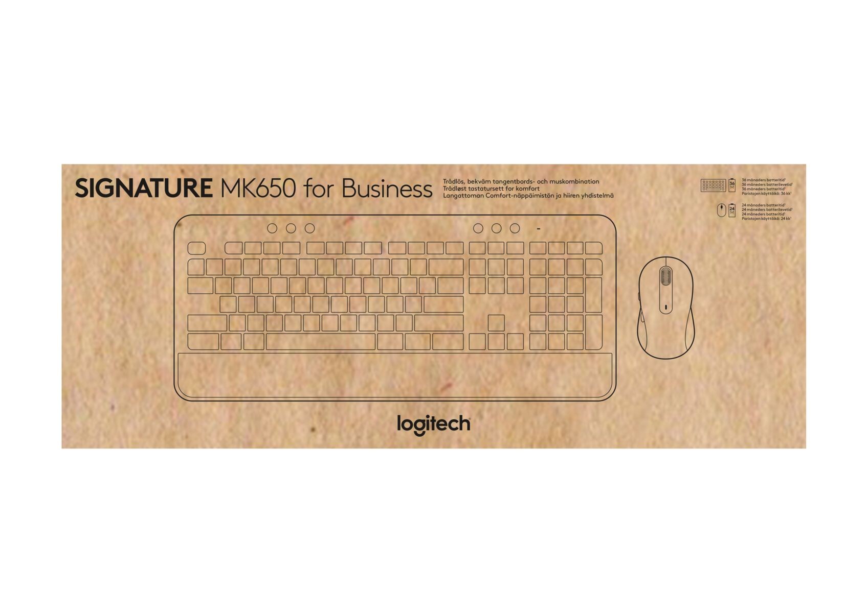 | Packaging content | Signature M650 for Business mouse Signature K650 for Business keyboard Logi Bolt USB receiver (USB Type A) 1 AA battery for mouse 2 AA batteries for keyboard User documentation |