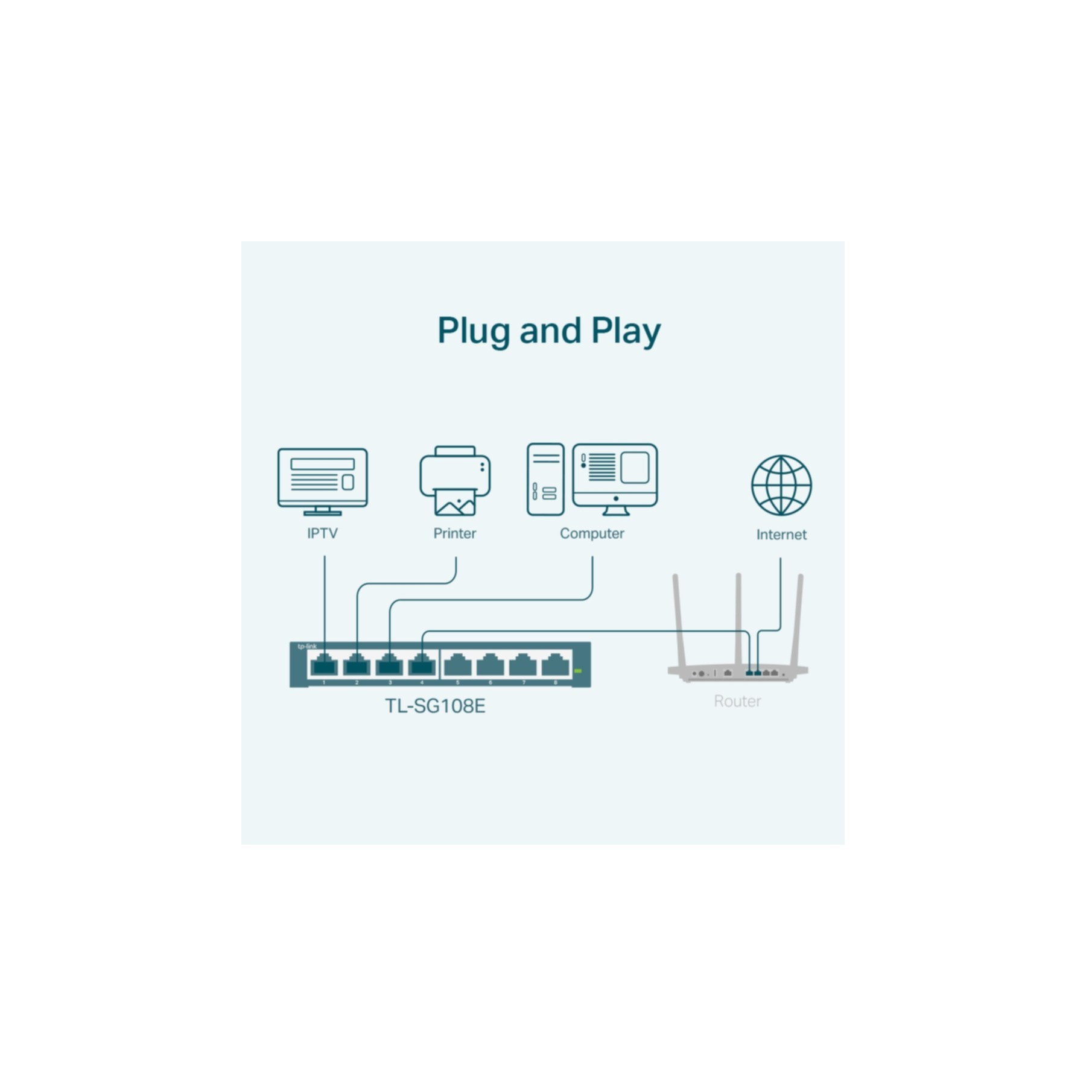 TL-SG108E is easy to use and manage. Auto MDI/MDI-X crossover on all ports eliminate the need for crossover cables or uplink ports. Auto-negotiation on each port senses the link speed of a network device (either 10, 100, or 1000 Mbps) and intelligently adjusts for compatibility and optimal performance. Its compact size makes it ideal for desktops with limited space while also being Rack-mountable, convenient and safe. Dynamic LED lights provide real-time work status display and basic fault diagnosis.