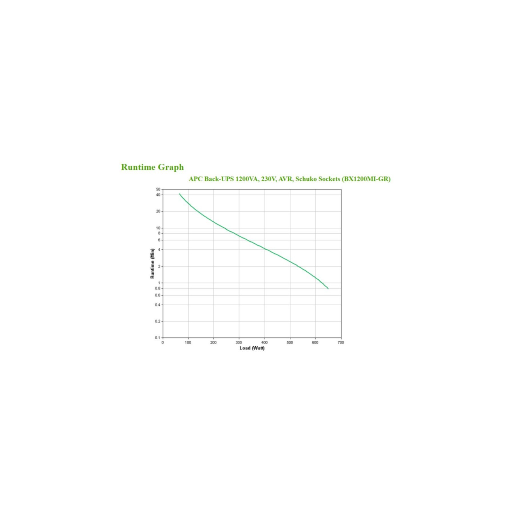 APC Back-UPS. 1200VA. Tower. 230V. 4x CEE 7/7 Schuko outlets. AVR. UPS topology: Line-Interactive. Output power capacity: 1.2 kVA. Output power: 650 W. AC outlet types: Type F. Power plug: Type F. AC outlets quantity: 4 AC outlet(s). Battery technology: Sealed Lead Acid (VRLA). Typical backup time at full load: 1 min. Typical backup time at half load: 5 min. Form factor: Compact. Product colour: Black. Cable length: 1.2 m. Compliance certificates: RoHS. Certification: CB Meet EN62040-1 / CE / IEC-62040-1 / IEC-62040-2