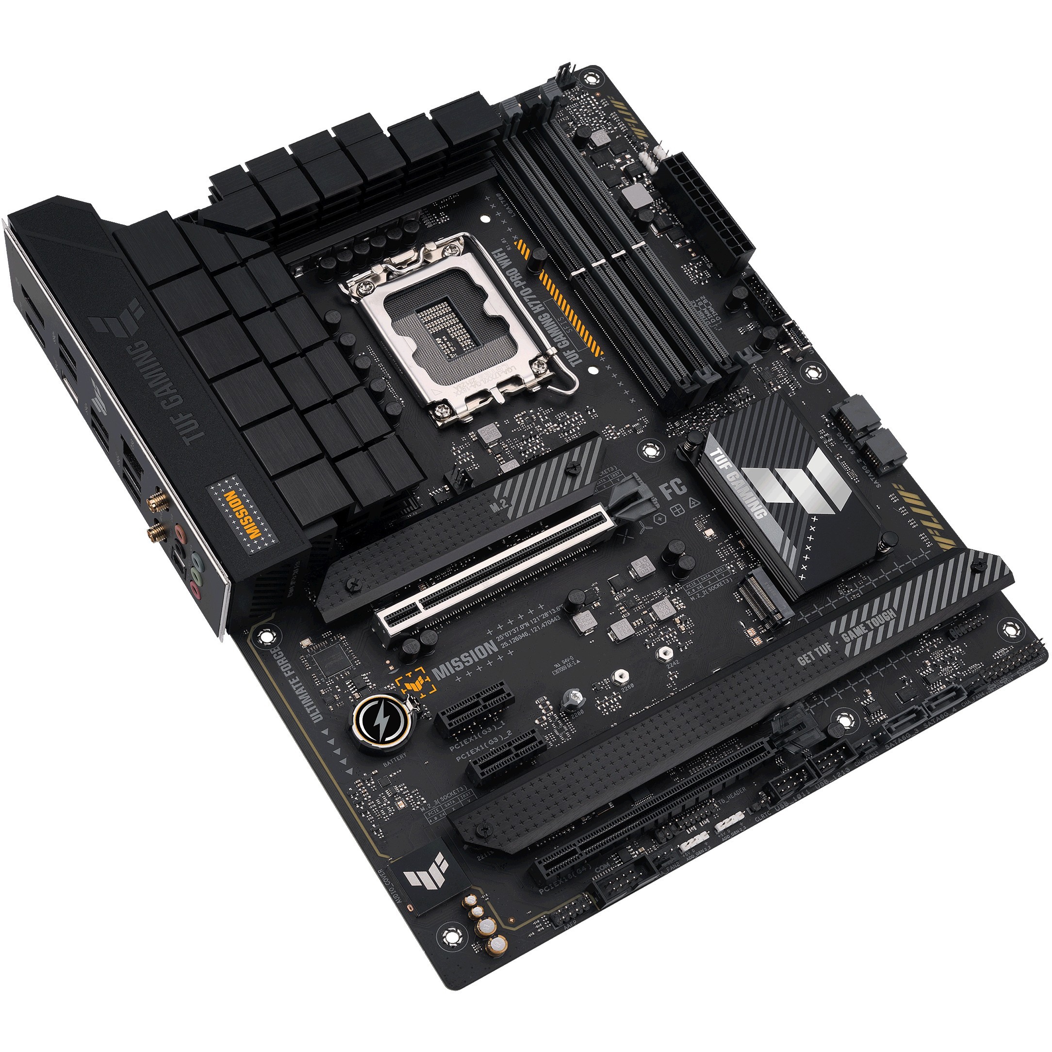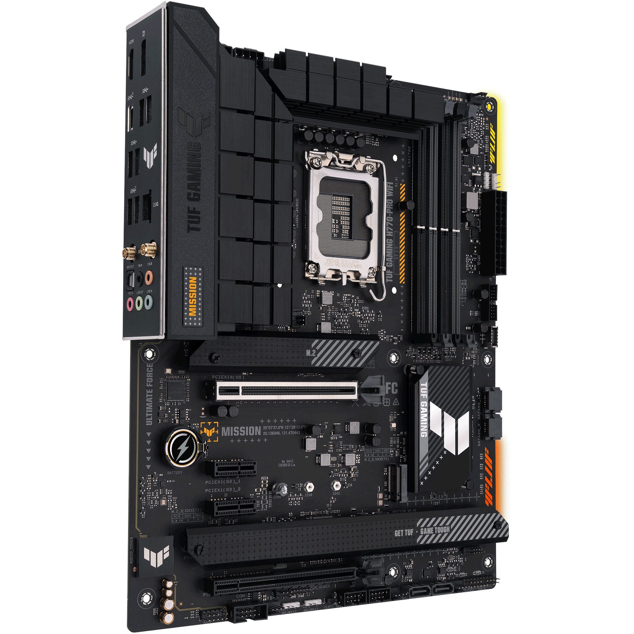 ASUS TUF GAMING H770-PRO WIFI. Processor manufacturer: Intel. Processor socket: LGA 1700. Compatible processor series: Intel® Celeron®. Intel® Core™ i3. Intel® Core™ i5. Intel® Core™ i7. Intel® Core™ i9..... Supported memory types: DDR5-SDRAM. Maximum internal memory: 128 GB. Memory slots type: DIMM. Supported storage drive interfaces: M.2. SATA III. Supported storage drive types: HDD & SSD. RAID levels: 0. 1. 5. 10. Ethernet interface type: 2.5 Gigabit Ethernet. Top Wi-Fi standard: Wi-Fi 6 (802.11ax). Wi-Fi standards: 802.11a. 802.11b. 802.11g. Wi-Fi 4 (802.11n). Wi-Fi 5 (802.11ac). Wi-Fi 6 (802.11ax). Component for: PC. Motherboard form factor: ATX. Motherboard chipset family: Intel