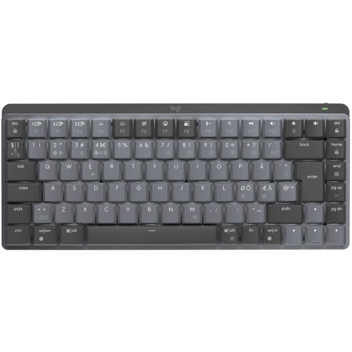 Logitech MX Mechanical Mini. Keyboard form factor: Tenkeyless (80 - 87%). Keyboard style: Straight. Connectivity technology: Wireless. Device interface: RF Wireless + Bluetooth. Keyboard key switch: Mechanical. Keyboard layout: QWERTY. Backlight type: LED. Cable length: 1 m. Recommended usage: Office. Product colour: Graphite