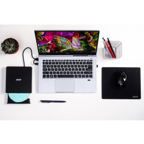 External Acer AXD001 slot-load DVD±RW drive (Black). USB 3.2 Gen1 interface, 24x CD / 8x DVD speeds, M-DISC support, slim and portable for laptops.