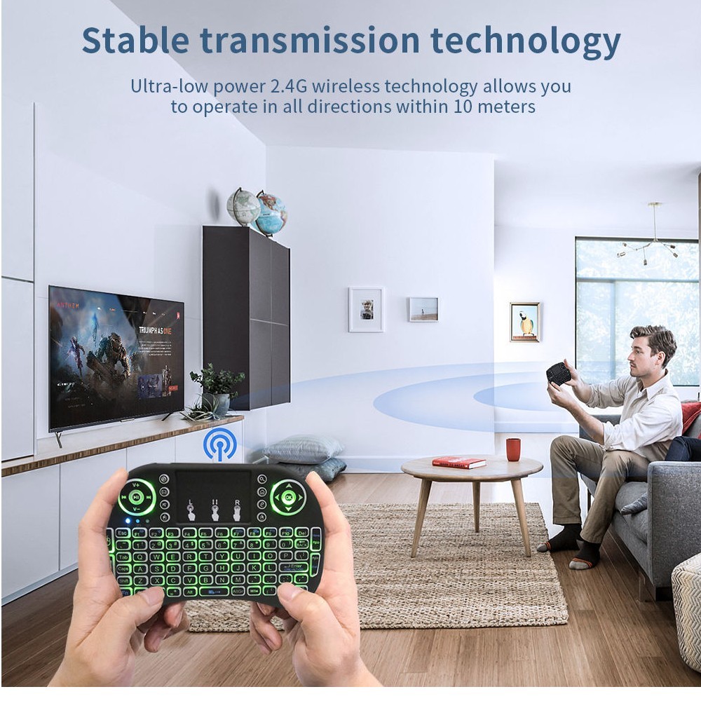 The GT Media Mini Keyboard I8 is a versatile 3-in-1 device combining a wireless QWERTY keyboard, touchpad mouse, and LED backlit keys. Perfect for HTPCs, Android TV boxes, gaming consoles like Xbox 360/PS3, and laptops. Its ergonomic handheld design with 360-degree flip touchpad ensures easy navigation in any orientation.